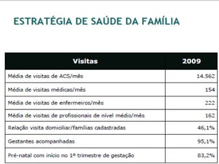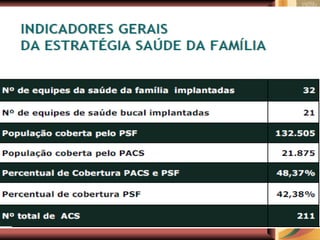 O Programa Saúde da Família (PSF) é uma estratégia de reorientação do modelo assistencial que visa promover saúde através de equipes multiprofissionais em unidades básicas de saúde. Desde sua criação em 1991, o PSF tem como objetivo prestar assistência integral e contínua, desenvolver ações educativas e mobilizar a comunidade para o controle social. As equipes, compostas por médicos, enfermeiros e agentes comunitários, são responsáveis pelo acompanhamento de famílias em territórios definidos, buscando intervenções nos fatores de risco à saúde.