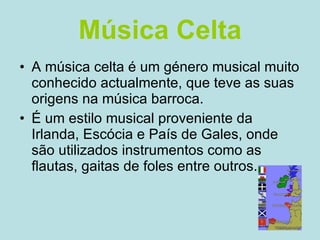 A música celta tem suas origens na música barroca da Irlanda, Escócia e País de Gales, onde instrumentos como flautas e gaitas de foles são utilizados. Somente nos anos 1960 é que a música celta se popularizou nos Estados Unidos e Europa. As subdivisões mais comuns da música celta são New Age, Tradicional, Fusion e Folk.