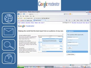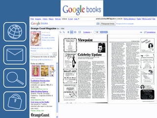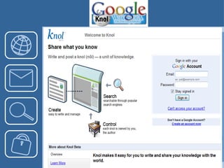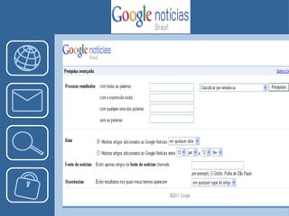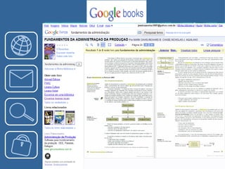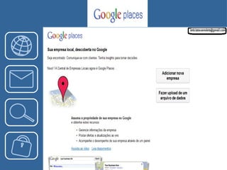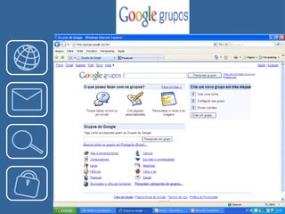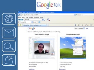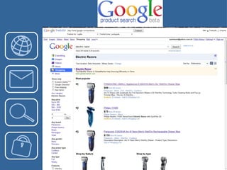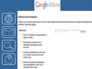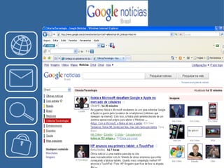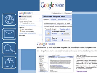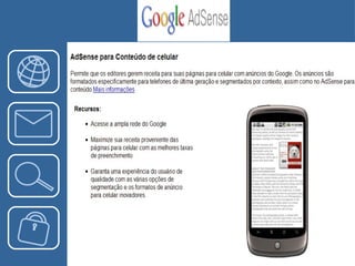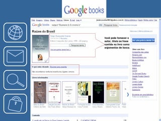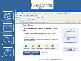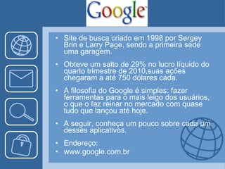 O documento apresenta uma visão geral dos principais serviços e aplicativos oferecidos pelo Google, desde busca na web até ferramentas de comunicação e colaboração. Destaca a filosofia da empresa de criar produtos acessíveis a todos, além de informações sobre o crescimento financeiro e inovações. Cada serviço é descrito com seu propósito, endereço e características principais.