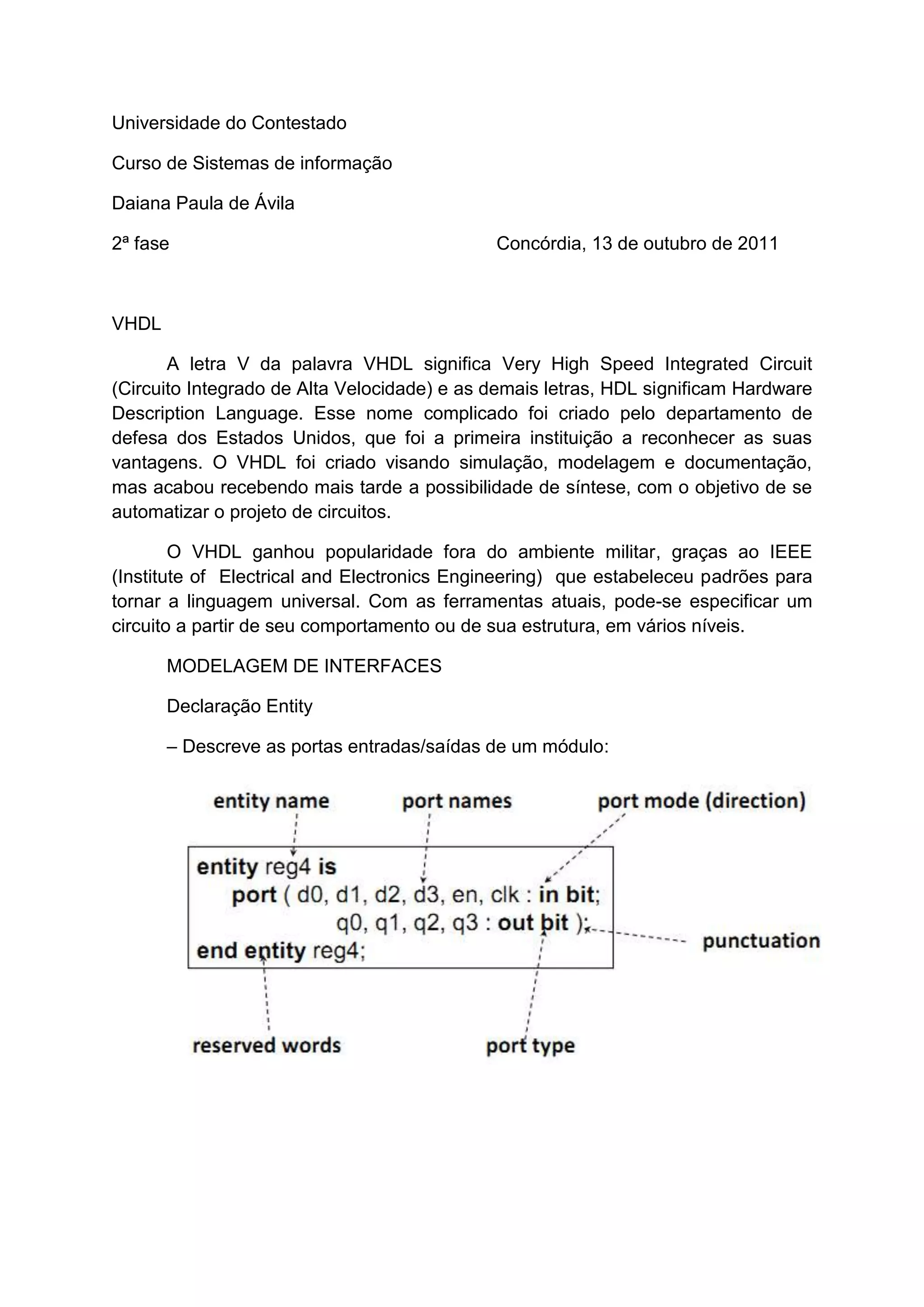 O documento descreve conceitos básicos da linguagem de descrição de hardware VHDL, incluindo sua origem, tipos de objetos como constantes e sinais, declaração de entidades e arquiteturas, e tipos de operadores.