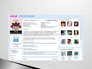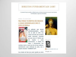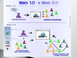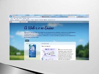 O documento discute a Web 1.0 e Web 2.0, destacando que a Web 2.0 permite maior interatividade e troca de informações entre usuários, ao contrário da Web 1.0 que era mais passiva. Também aborda como recursos da Web 2.0 como wikis e sites de compartilhamento podem ser usados educacionalmente. Por fim, analisa um blog sobre direitos LGBT que lista 78 direitos negados a casais homossexuais, contra os 37 apontados originalmente.
