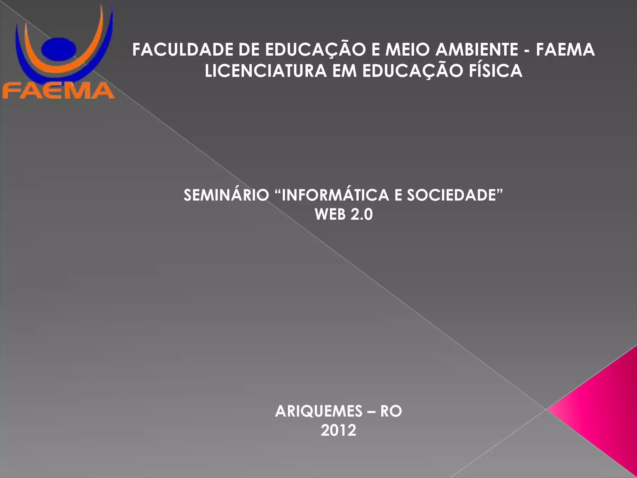 O documento discute a Web 2.0, definindo-a como uma segunda geração de serviços e aplicativos da Internet que permitem maior interatividade e colaboração entre usuários. Ele explica que o termo surgiu em 2004 e descreve conceitos-chave como redes sociais, controle da informação pelo usuário e ferramentas na forma de serviços web. Finalmente, exemplifica algumas redes sociais populares como Facebook, Orkut e Twitter.