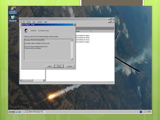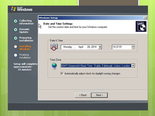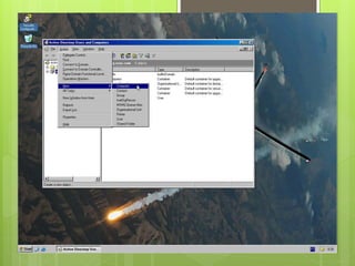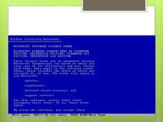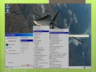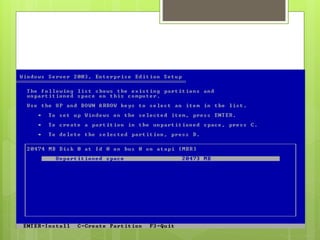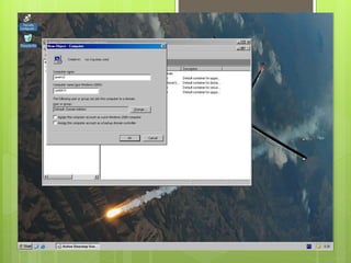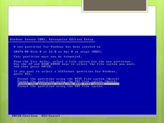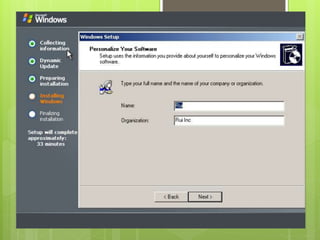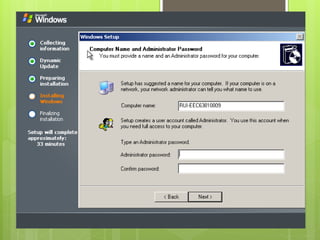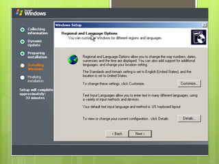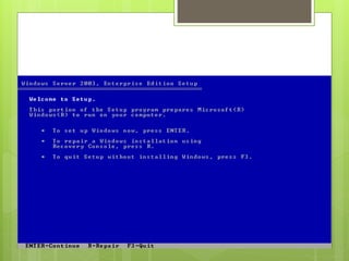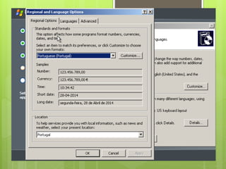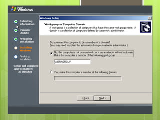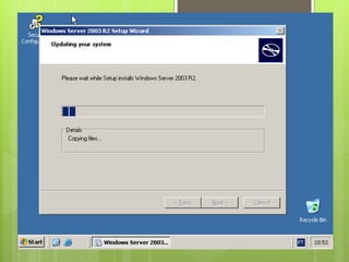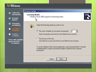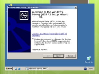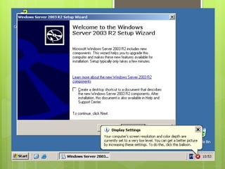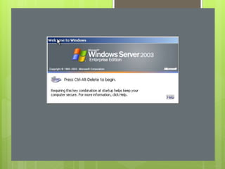 Sistema operativo servidor controla outros computadores e prioriza serviços como webmail e bancos de dados. Windows Server 2003 foi lançado em 2003 e usa uma versão do Windows XP para maior estabilidade. Requisitos mínimos incluem 128 MB de memória e 1.5 GB de disco rígido. Active Directory armazena informações de rede e disponibiliza com uma única senha.