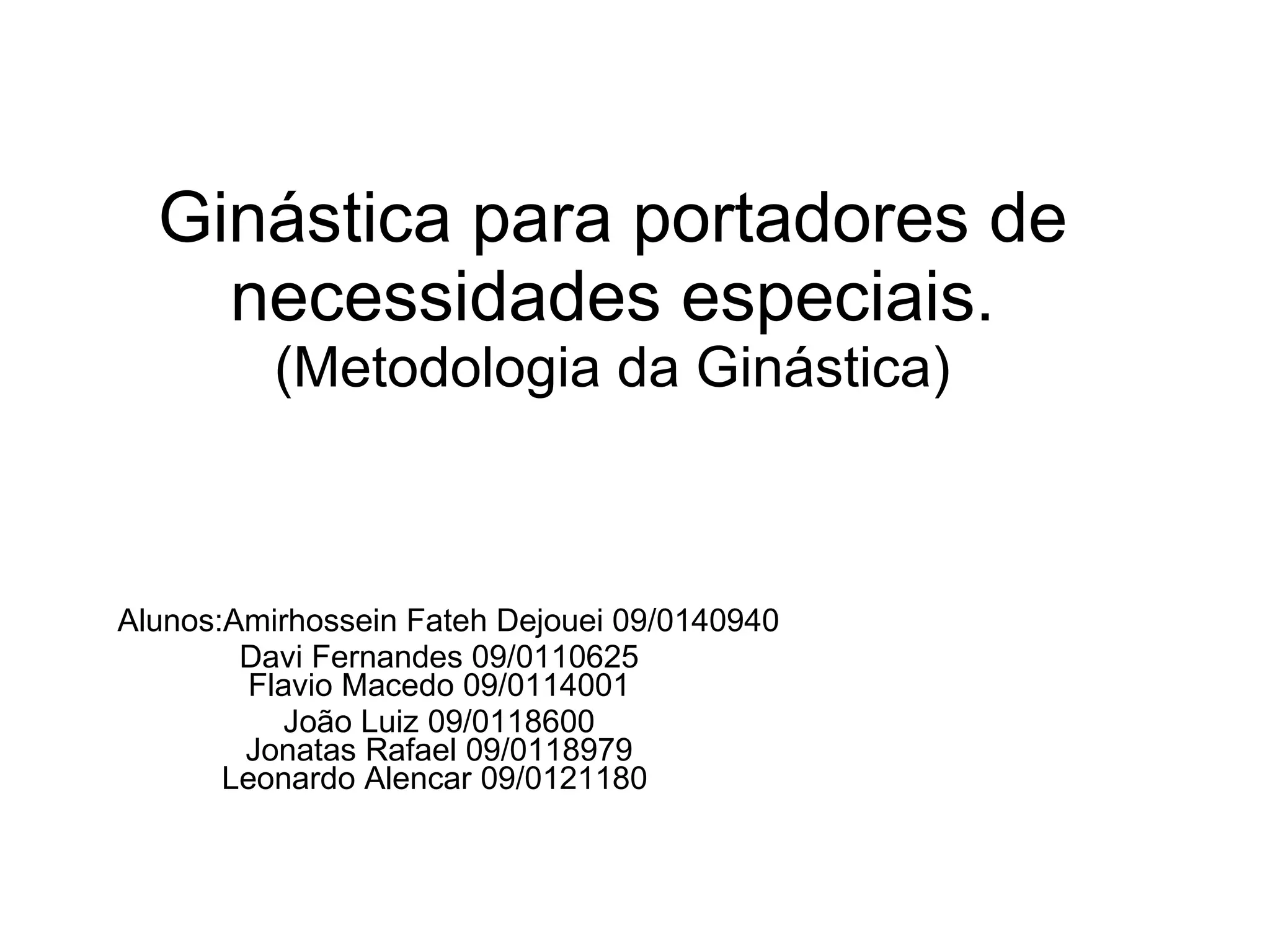 Ginástica para portadoresde necessidades especiais. (Metodologia da Ginástica) Alunos:Amirhossein Fateh Dejouei 09/0140940 Davi Fernandes 09/0110625 Flavio Macedo 09/0114001 João Luiz 09/0118600 Jonatas Rafael 09/0118979 Leonardo Alencar 09/0121180