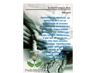 Anexo: Conhecendo otrabalho da APAE Missão: Promover e articular ações de defesa dos direitos das pessoas com deficiência e representar o movimento perante os organismos nacionais e internacionais, para a melhoria da qualidade dos serviços prestados pelas APAES, na perspectiva da inclusão social de seus usuários.