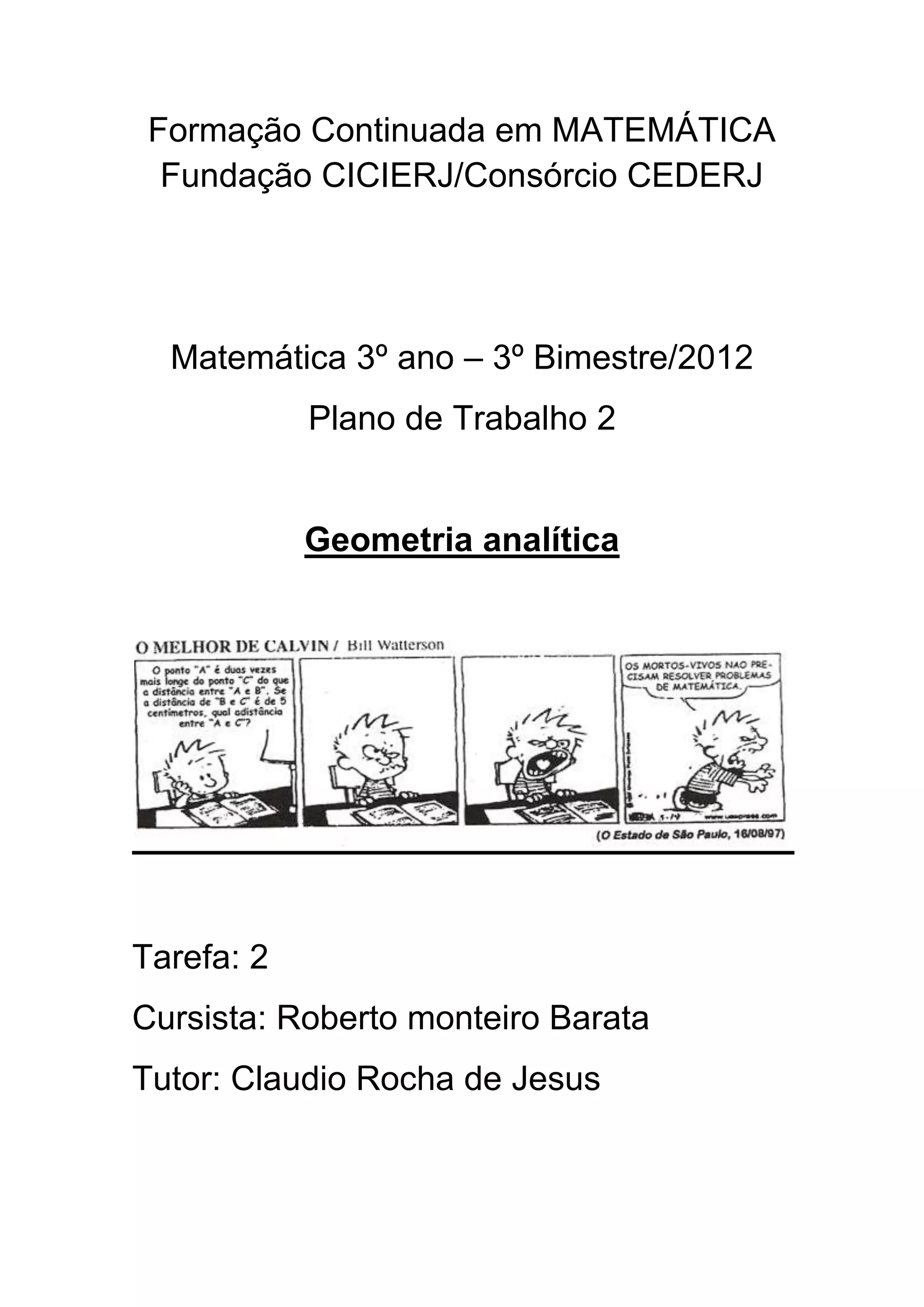 Este documento apresenta um plano de trabalho para um curso de matemática do 3o ano do ensino médio sobre geometria analítica. O plano inclui instruções para atividades sobre distância entre pontos, equações de retas e posições relativas entre retas.
