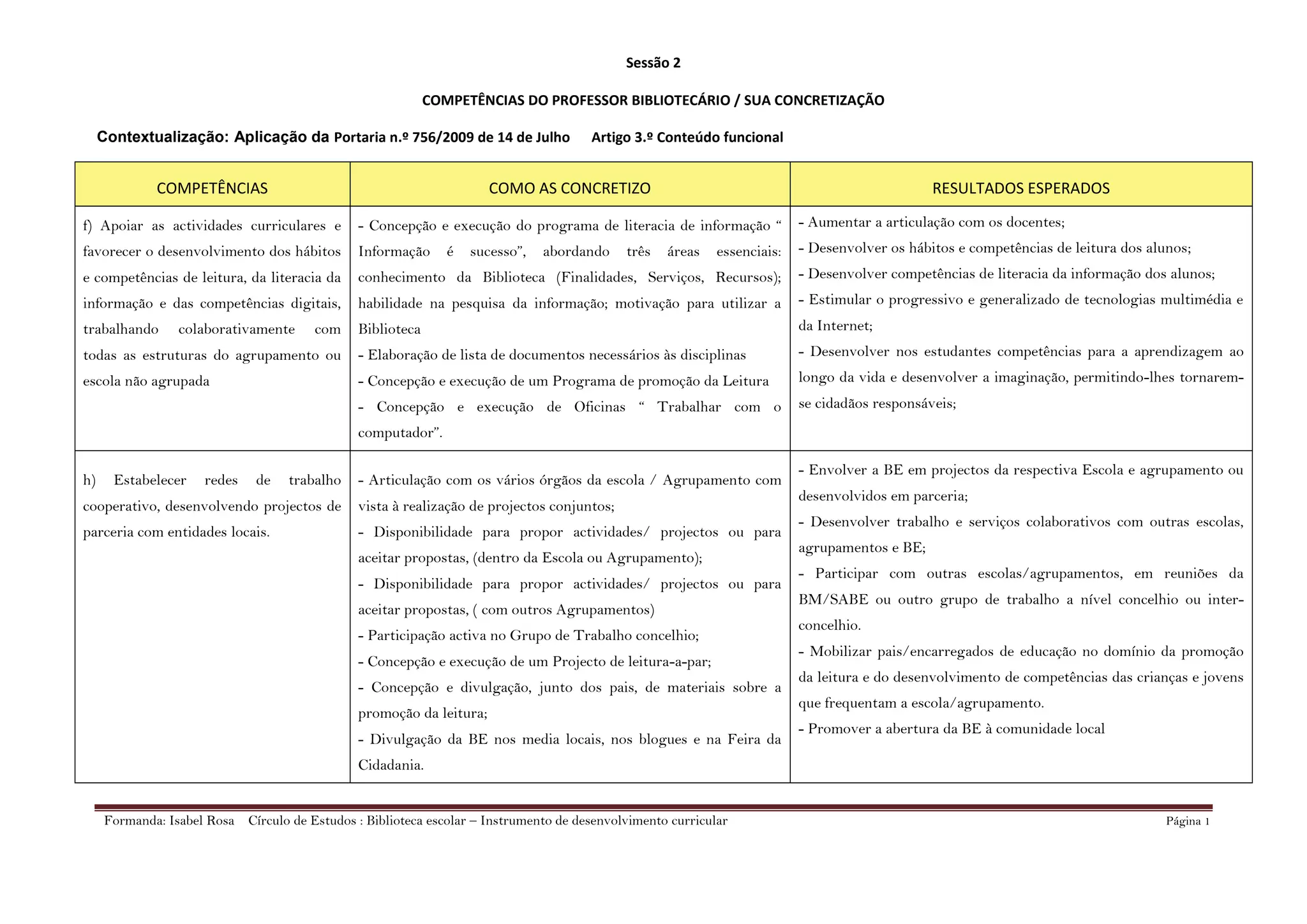 Este documento descreve as competências e responsabilidades de um bibliotecário escolar. Ele/ela deve apoiar as atividades curriculares desenvolvendo hábitos de leitura e competências digitais através de programas como "Informação é Sucesso" e oficinas sobre computadores. Além disso, o bibliotecário deve estabelecer redes de trabalho cooperativo com a escola, outros agrupamentos e a comunidade local por meio de projetos conjuntos e participação em grupos de trabalho.