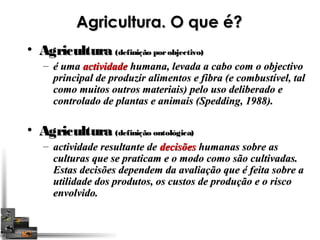 Este documento discute a agricultura, incluindo definições, níveis de decisão, sequências de operações, fatores de produção como trabalho e equipamento, e limites da capacidade humana de trabalho. Aborda também os subsistemas da agricultura e como a tecnologia de produção resulta da combinação ordenada desses fatores para atingir objetivos agrícolas.
