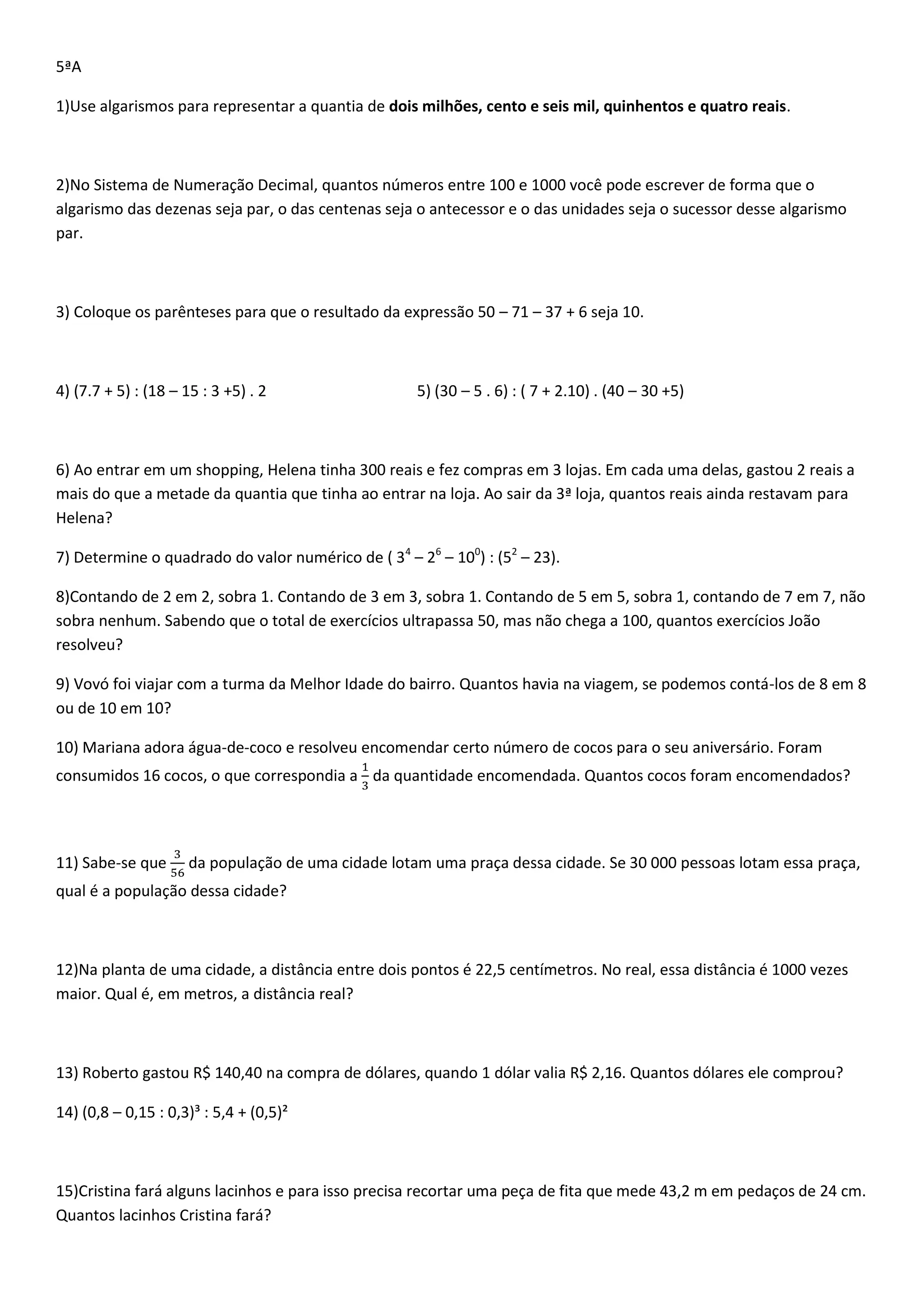 5) Determine o quadrado do valor numérico de ( 34 – 26 – 100) : (52 – 23).