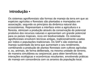 Este documento discute a implementação de sistemas agroflorestais (SAFs) em uma propriedade de 6 hectares no litoral paranaense. Ele descreve os princípios dos SAFs e objetiva recuperar o solo degradado da propriedade através do plantio de diversas espécies vegetais nativas que forneçam alimentos, renda e serviços ecossistêmicos. A metodologia envolve o cultivo inicial de plantas fixadoras de nitrogênio para adubar o solo, seguido pelo plantio de culturas anuais e perenes