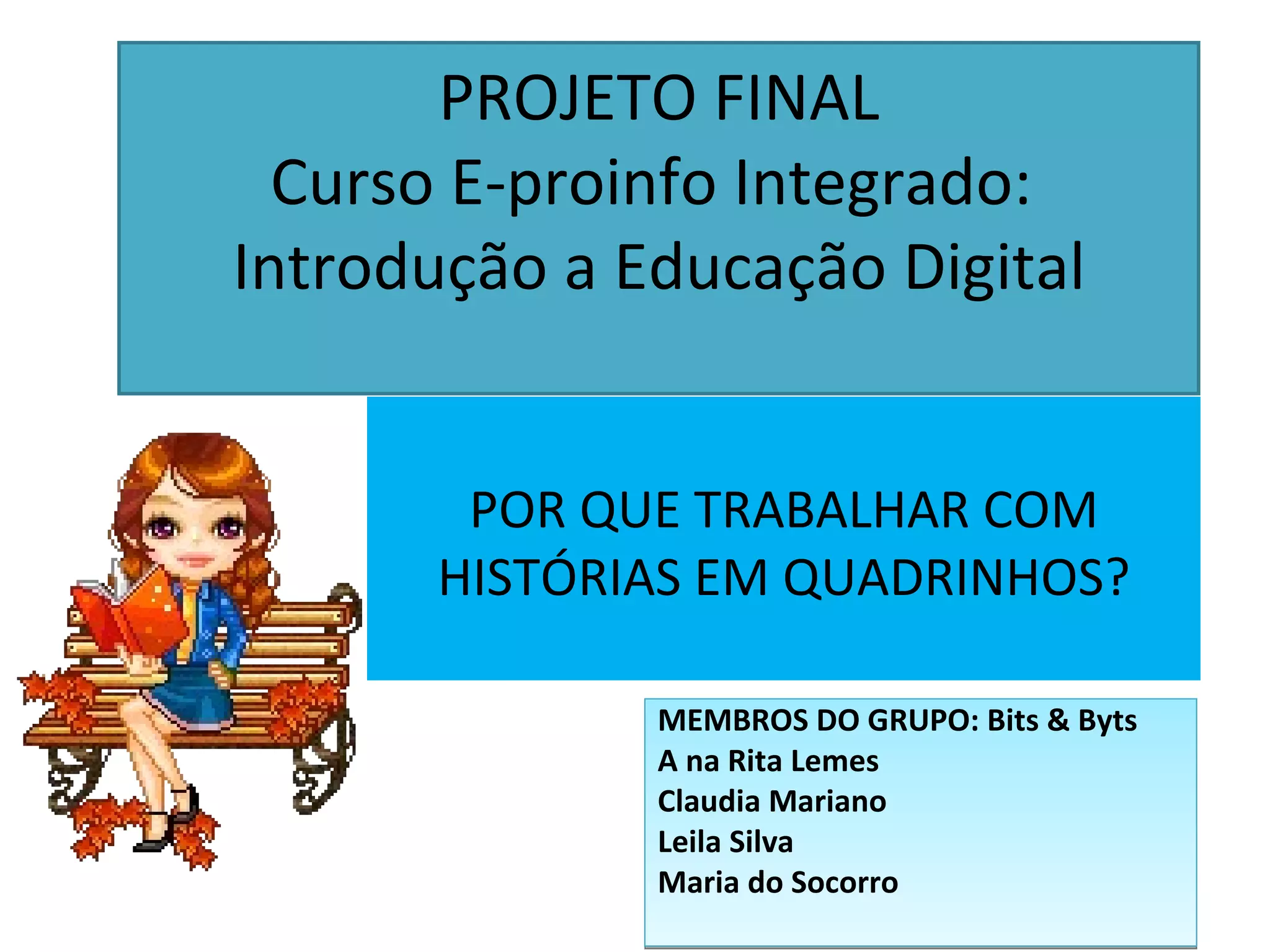 - O documento apresenta um projeto final sobre o uso de histórias em quadrinhos para a formação de professores, desenvolvido por um grupo chamado Bits & Byts.