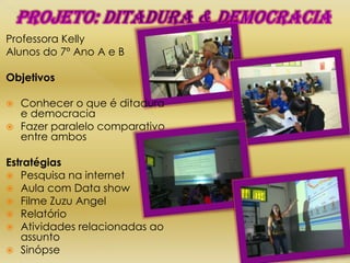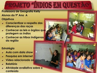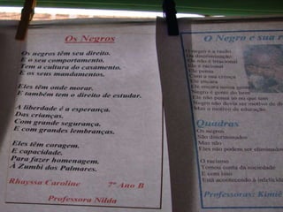 O documento apresenta vários projetos realizados por professores e alunos de uma escola municipal sobre temas relacionados à cultura africana e sua influência no Brasil, incluindo capoeira, candomblé e culinária, além de outros projetos sobre diversas regiões e culturas do mundo.
