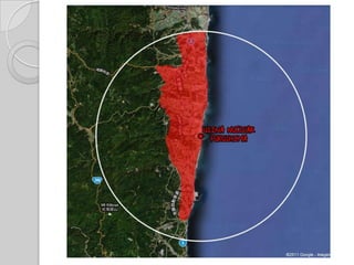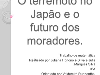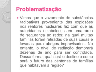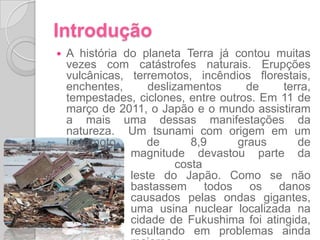 O documento descreve um terremoto e tsunami que atingiu o Japão em 2011, causando grandes danos. O terremoto foi classificado como de magnitude 8,9 e provocou um tsunami de até 10 metros de altura que devastou a costa leste do país. O tsunami também causou um acidente nuclear na usina de Fukushima quando danificou seus sistemas de resfriamento.