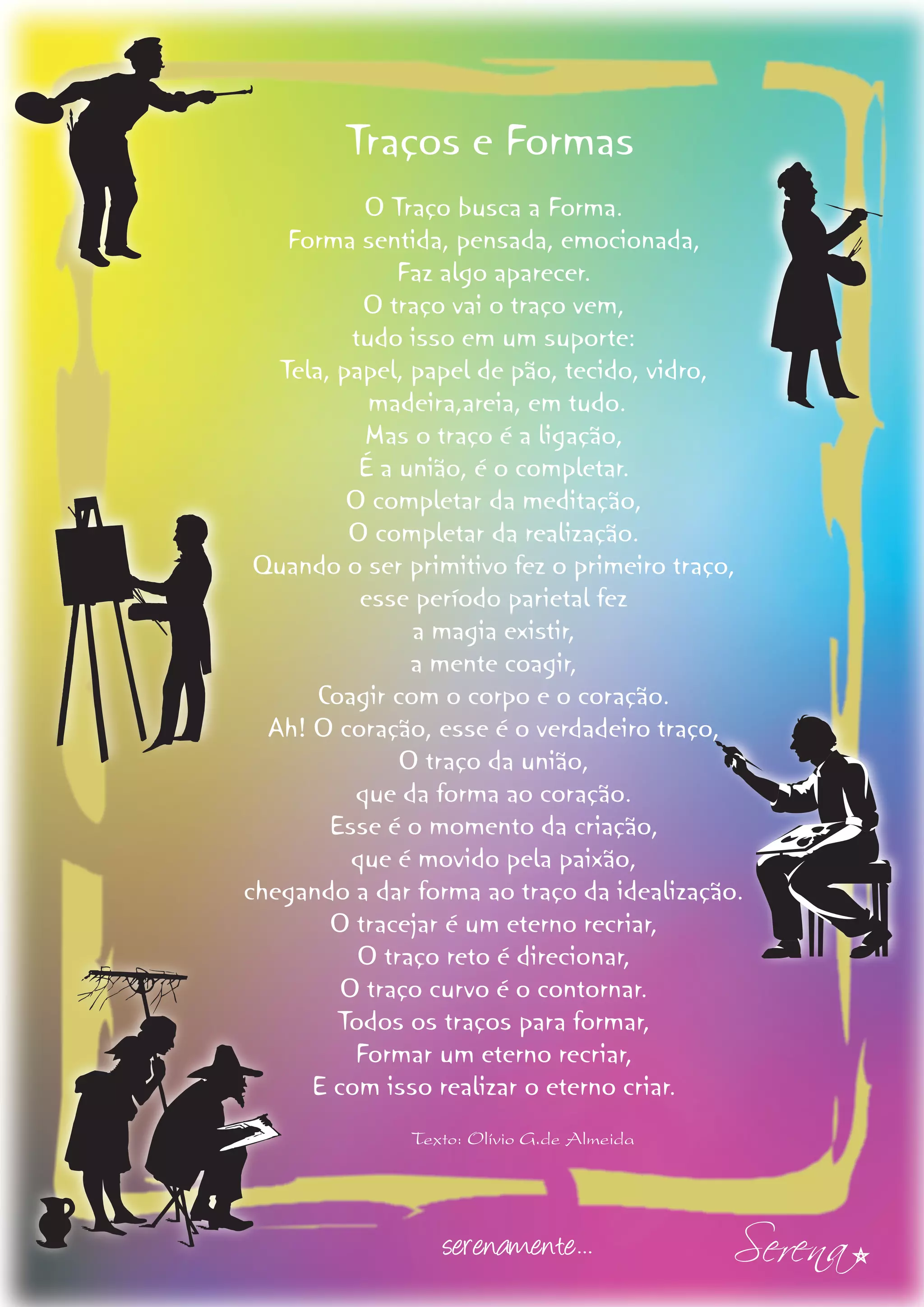 O documento discute a relação entre o traço e a forma na criação artística. Ele explora como o traço busca dar forma às ideias e emoções do artista através de diferentes meios como papel, madeira ou areia. O documento também reflete sobre como os primeiros traços rupestres representaram a magia e a criatividade humanas, dando forma ao coração e à alma do artista.