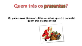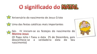 O documento descreve várias tradições associadas ao Natal e Ano Novo em Portugal, incluindo a figura do Pai Natal, a Missa do Galo, a Ceia de Natal, o Presépio, a Árvore de Natal, o Bolo Rei, as Janeiras e as celebrações do Dia de Reis.