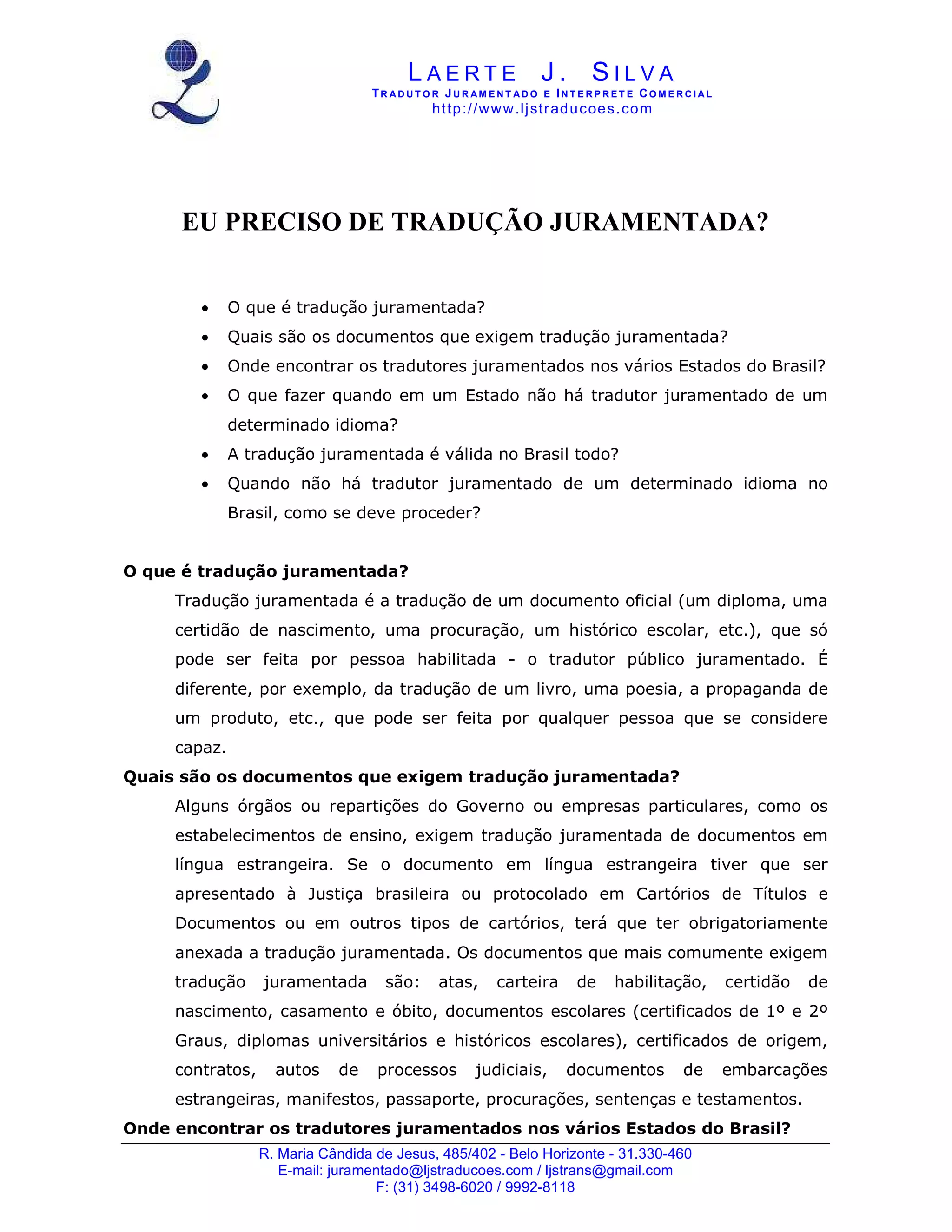 O documento aborda a tradução juramentada, explicando que é necessária para documentos oficiais como diplomas e certidões, e pode ser realizada apenas por tradutores públicos habilitados. Destaca também a validade da tradução em todo o Brasil e orientações sobre como proceder caso não haja tradutor juramentado disponível em determinado idioma. Informações sobre como encontrar tradutores e a possibilidade de nomeação de tradutores 'ad hoc' por consulados são igualmente mencionadas.