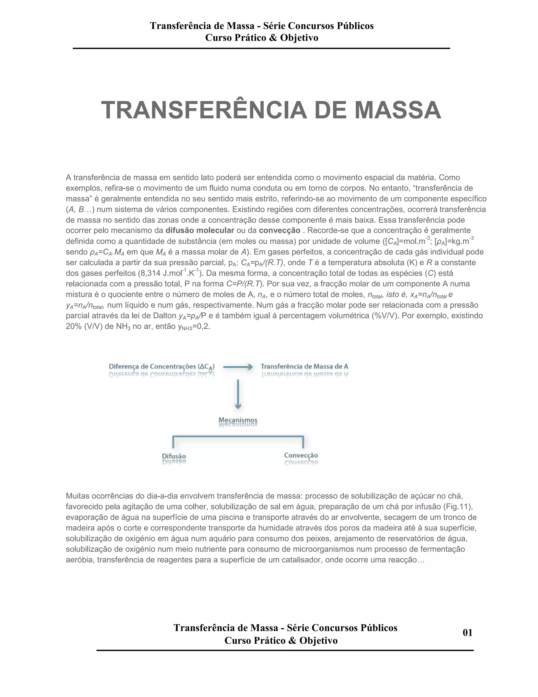 O documento descreve os conceitos fundamentais da transferência de massa entre fases. A transferência de massa pode ocorrer por difusão molecular ou convecção, movendo componentes de regiões de alta para baixa concentração. A velocidade de transferência depende do gradiente de concentração e da difusividade ou coeficiente de transferência de massa. Equilíbrios entre fases são descritos por leis como Lei de Henry ou Raoult.