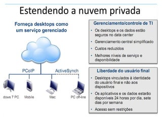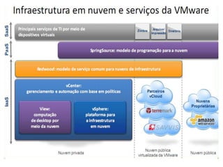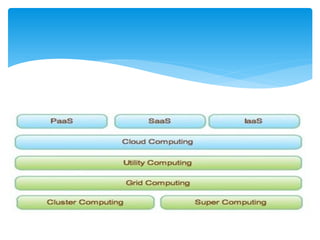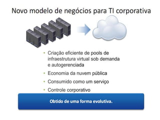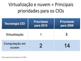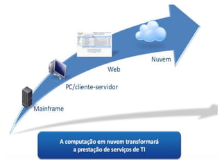 O documento discute a evolução da computação em nuvem e virtualização, destacando suas aplicações em modelos como SaaS, PaaS e IaaS. Apresenta também ferramentas e práticas para implementação, como AWS e Google App Engine, além de abordar os desafios e o futuro da computação em nuvem. O autor, Darlan Segalin, enfatiza a importância de profissionais com habilidades em cloud computing no cenário atual de tecnologia da informação.