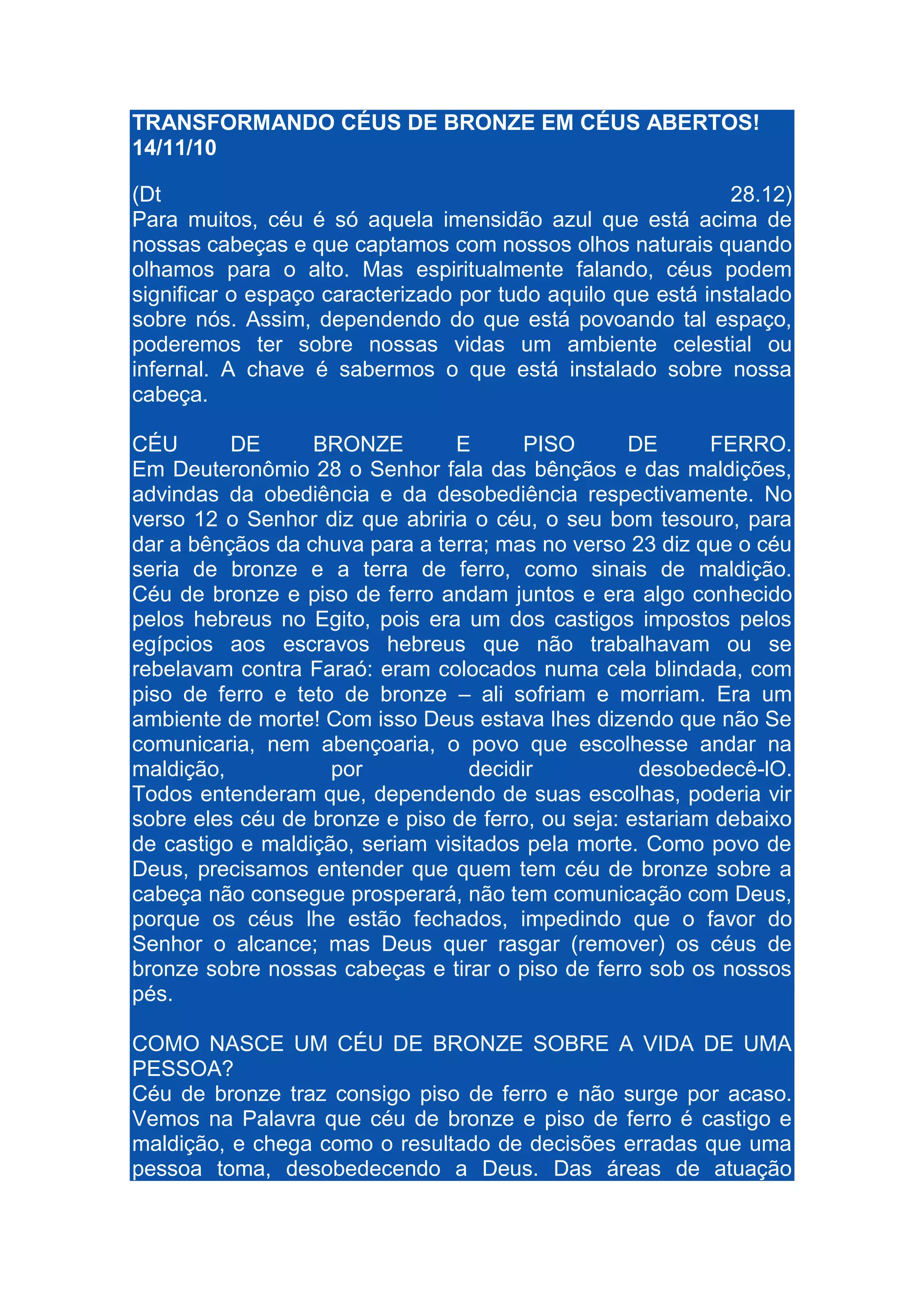 O documento discute como as palavras podem criar "céus de bronze" ou "céus abertos" sobre nossas vidas. Céus de bronze, segundo a Bíblia, representam maldição e castigo, enquanto céus abertos representam bênçãos. O documento sugere que confessar pecados, arrepender-se e mudar atitudes podem ajudar a transformar céus de bronze em céus abertos.