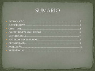Este documento descreve um projeto educacional chamado "Transformando o Lixo" que tem como objetivo conscientizar estudantes sobre a importância da preservação ambiental e da reciclagem. O projeto utilizará vídeos, experimentos, visitas a cooperativas de reciclagem e uma feira cultural para ensinar os alunos sobre poluição, ciclos naturais e formas sustentáveis de lidar com resíduos.