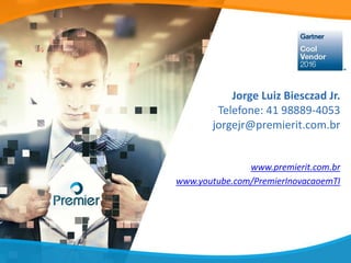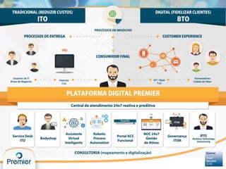 O documento apresenta soluções de TI da Premier IT, destacando a hiperconectividade e a integração de processos com foco em otimização e redução de custos. Menciona a redução de 40% em renovação de licenças SAP e o aumento de 12% no crescimento ao integrar o Business Technology Optimization (BTO). Enfatiza a importância da transformação digital e a centralização do atendimento ao cliente para melhorar a satisfação e a eficiência operacional.