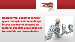Mutação genética ocorre quando há mudanças nos genes, como adição, eliminação ou substituição de nucleotídeos no DNA. Isso gera novas formas de genes e variabilidade genética, transmitidas aos descendentes. Mutações são mudanças aleatórias no material genético.