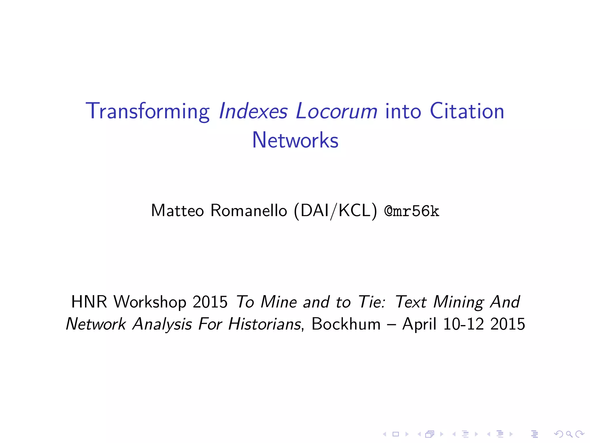 1) O documento descreve como índices de locorum podem ser transformados em redes de citações extraídas de textos clássicos.