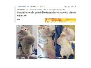 O documento discute os riscos potenciais dos alimentos geneticamente modificados (OGM) para a saúde, citando estudos que encontraram tumores em ratos alimentados com milho transgênico e a recusa da Europa em consumir esses produtos. Também destaca a obrigatoriedade do símbolo "T" em embalagens de alimentos com mais de 1% de OGM e faz um apelo para boicotar o consumo desses alimentos.
