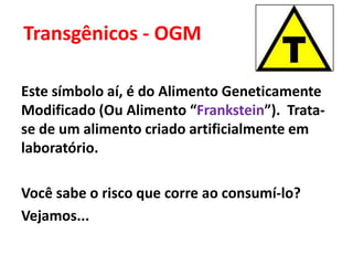 O documento discute os riscos dos alimentos geneticamente modificados (OGM) para a saúde. Estudos mostraram que ratos desenvolveram tumores ao consumir milho transgênico. A Europa boicota os OGM por considerá-los não seguros, ao contrário do Brasil. O documento pede que as pessoas evitem o consumo de alimentos transgênicos.