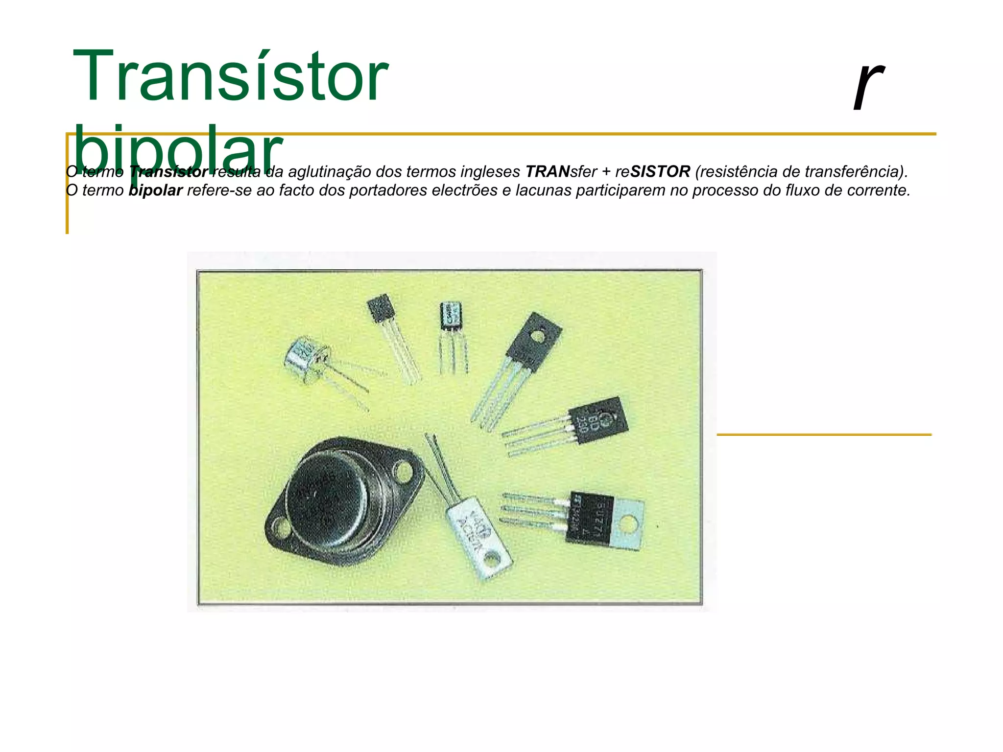 (1) O transístor bipolar é constituído por duas junções PN de material semicondutor (silício ou germânio) e três terminais: emissor, base e coletor. (2) Para conduzir, uma pequena corrente aplicada na base origina uma grande corrente entre o emissor e o coletor, amplificando sinais. (3) O transístor bipolar pode ser usado como interruptor, amplificador ou oscilador mediante polarização correta das junções PN.
