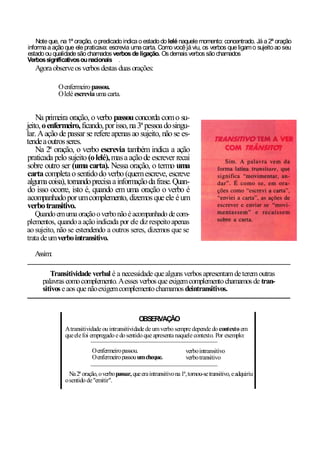 Este documento discute os conceitos de transitividade verbal, objeto direto e objeto indireto através da análise de uma piada e exemplos de orações. Explica que verbos transitivos requerem complementos e podem ser diretos ou indiretos, enquanto verbos intransitivos não requerem complementos.