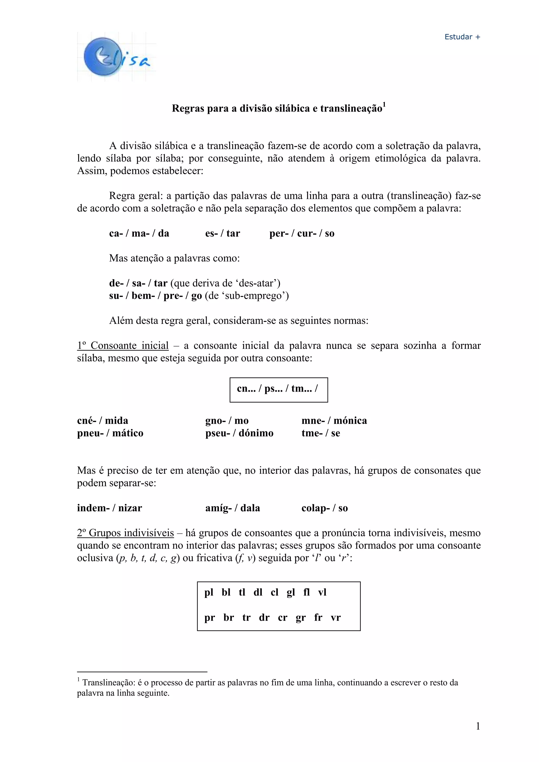 Este documento fornece 10 regras gerais para a divisão silábica e translineação de palavras em português. A divisão é feita de acordo com a soletração, não a etimologia. Grupos como "ch", "lh" e "nh" não podem ser separados, enquanto grupos de consoantes iguais podem. Ditongos também não são separados entre linhas.