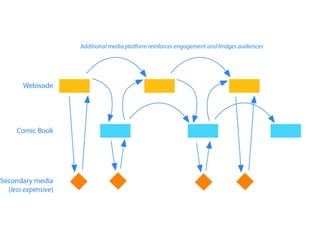 O documento discute os conceitos de mídia, multimídia e hipermídia, e apresenta as diferenças entre crossmídia e transmídia. Transmídia é definida como uma narrativa que utiliza múltiplas mídias de forma diferenciada para expandir a informação, com cada mídia explorando seus potenciais específicos e havendo diálogo entre elas.