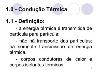 O documento discute os três tipos principais de transmissão de calor: condução, que ocorre por contato entre partículas; convecção, que envolve o transporte de matéria em meios fluidos; e irradiação, que ocorre sem contato por meio de ondas eletromagnéticas, principalmente no vácuo. A aplicação da transmissão de calor é discutida por meio do isolamento de garrafas.