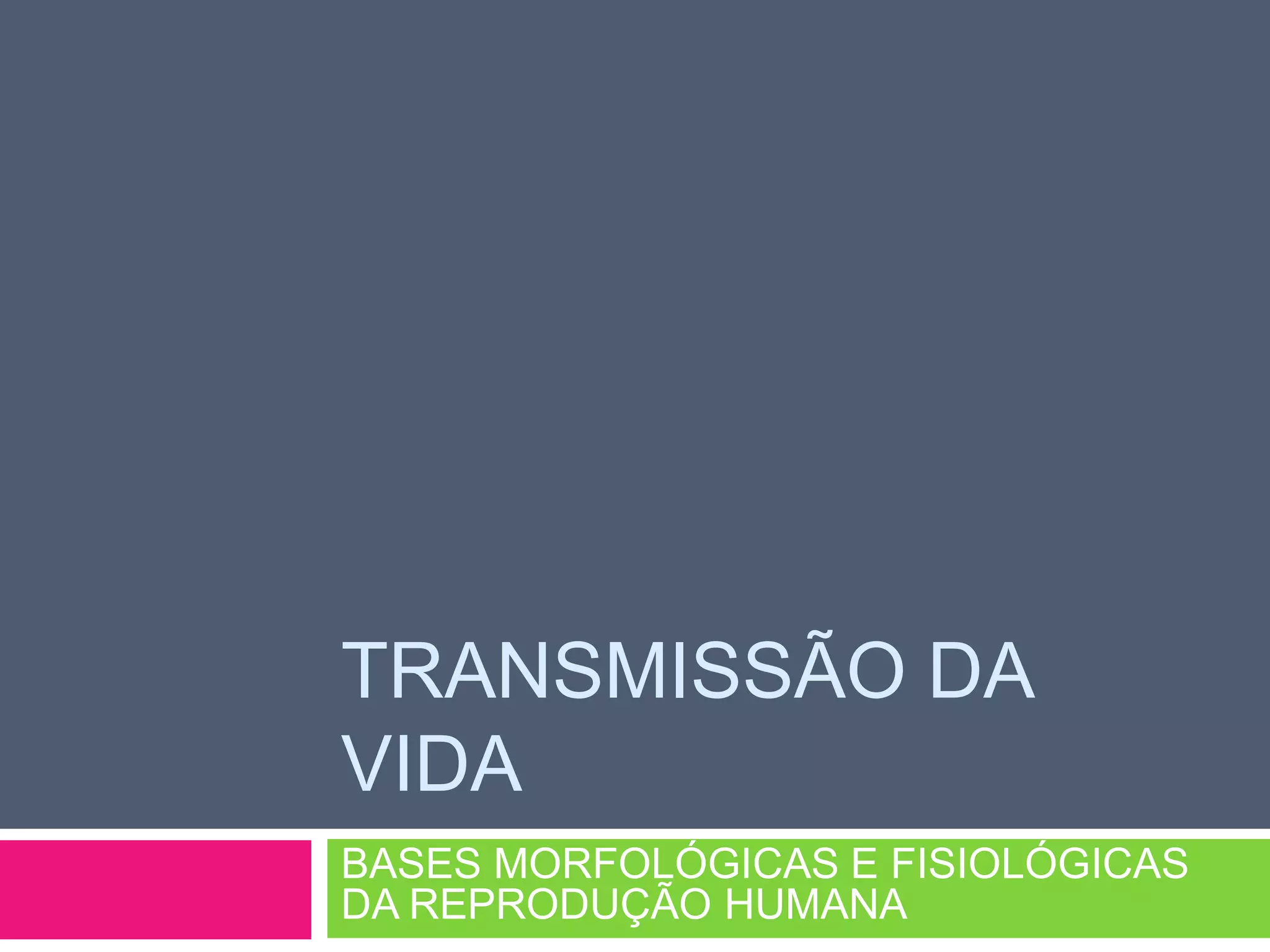 O documento discute as bases morfológicas e fisiológicas da reprodução humana, explicando os sistemas reprodutores masculino e feminino, a puberdade, os ciclos sexuais, a gravidez e métodos contraceptivos.