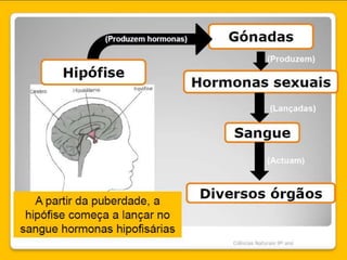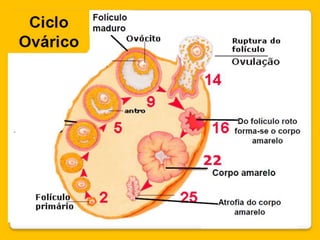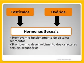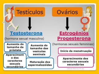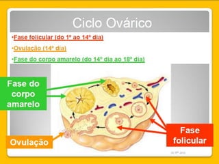O documento discute os sistemas reprodutores masculino e feminino, incluindo a puberdade, adolescência, ciclos sexuais, órgãos reprodutivos e regulação hormonal. Explica que a puberdade traz mudanças físicas enquanto a adolescência envolve mudanças emocionais e sociais. Também descreve os ciclos ovárico e uterino da mulher e como os níveis de hormônios como estrogênio e progesterona regulam estes ciclos.
