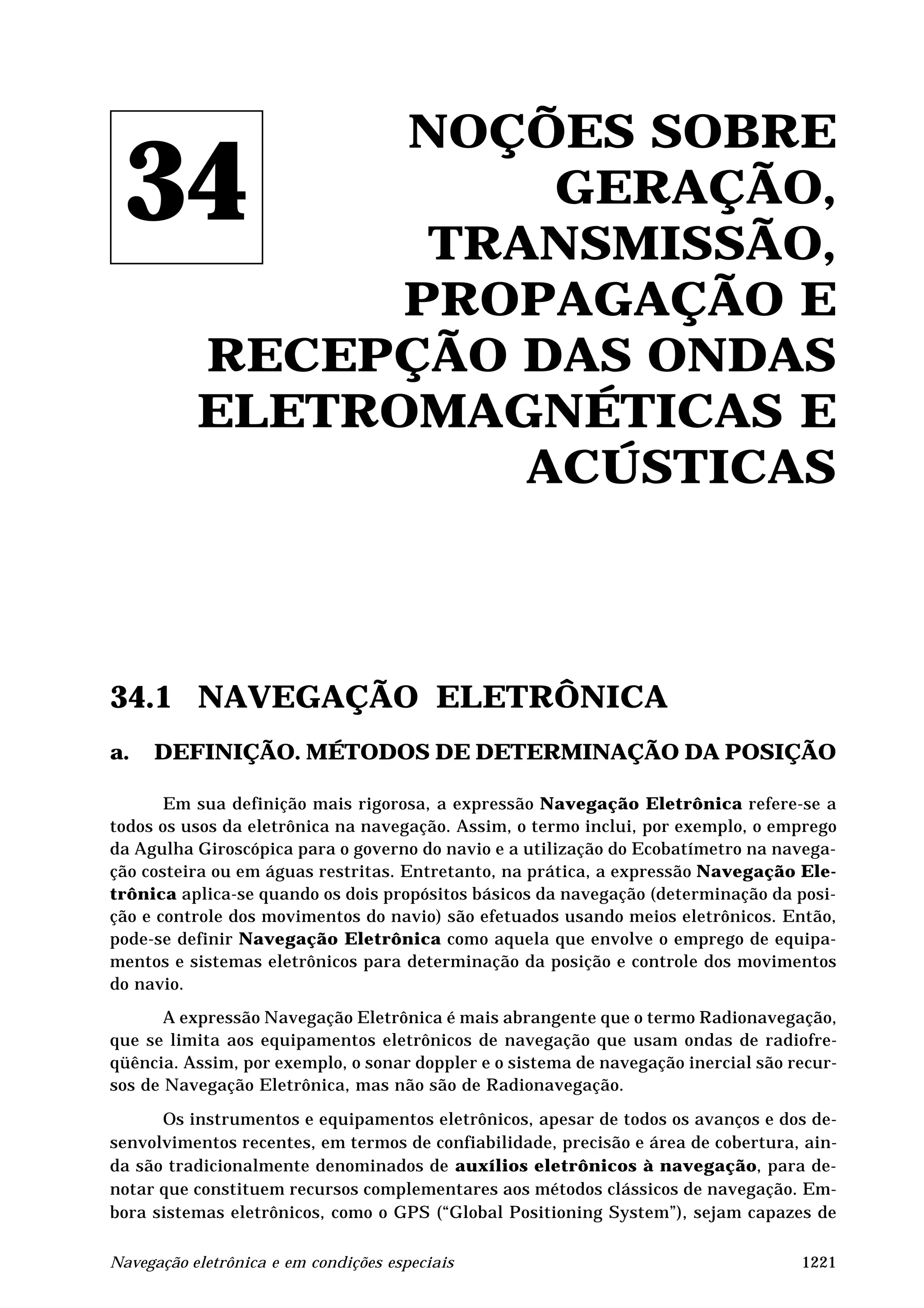 O documento discute os princípios da navegação eletrônica, incluindo a geração e propagação de ondas eletromagnéticas e acústicas. Aborda métodos de determinação da posição como direcional, medição de distâncias e composto direcional-distâncias. Também explica conceitos como precisão, previsibilidade e repetitibilidade em sistemas de navegação eletrônica.