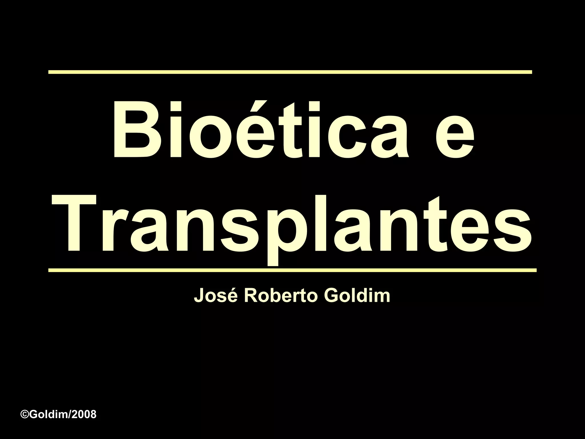 O documento discute os aspectos bioéticos relacionados aos transplantes. Aborda temas como a origem da bioética, os fatos, circunstâncias e referenciais teóricos envolvidos nos transplantes, como a moral, o direito e as leis que regulamentam a doação e remoção de órgãos.