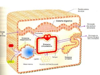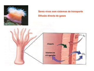 Alguns seres vivos como esponjas não possuem sistemas de transporte e realizam a difusão direta de gases. Outros possuem sistemas circulatórios abertos onde a hemolinfa circula livremente no corpo ou sistemas fechados com vasos que transportam a hemolinfa para todo o corpo.