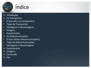 Este documento discute a importância dos transportes e telecomunicações na sociedade moderna. Ele explica os principais tipos de transporte terrestre, aquático e aéreo e lista suas vantagens e desvantagens. O documento também descreve os principais tipos de telecomunicações como internet e telefone celular e como eles impactaram a sociedade.
