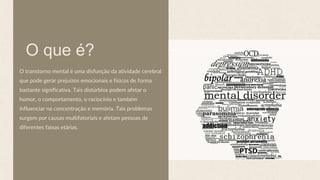 O documento aborda os transtornos mentais, destacando sua natureza multifatorial e os diversos tipos, como depressão e ansiedade. A ansiedade é explorada em detalhes, incluindo transtornos específicos como o transtorno de ansiedade generalizada e o transtorno de estresse pós-traumático. Também é descrito o transtorno obsessivo-compulsivo, caracterizado por obsessões e compulsões que interferem na vida da pessoa.