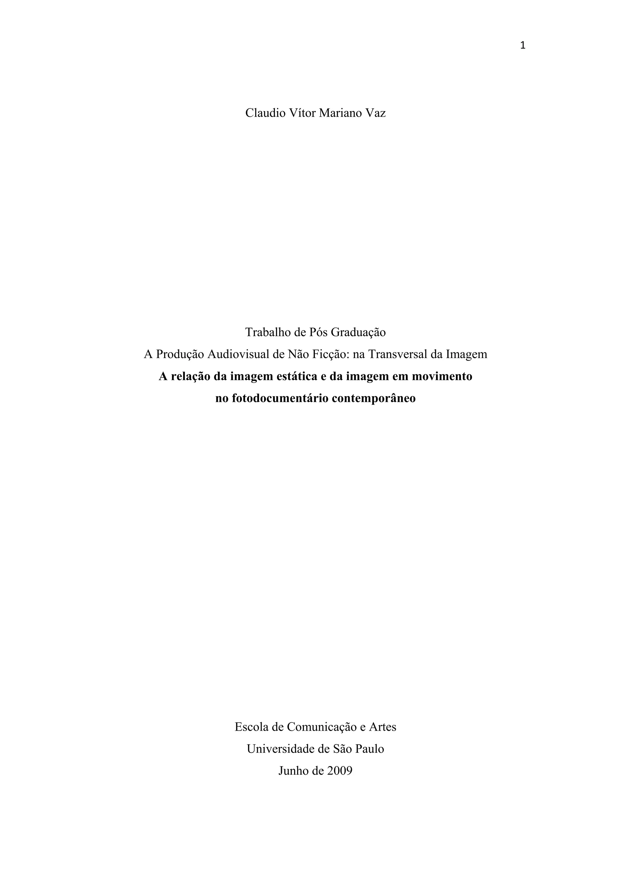 Este documento discute a relação entre a imagem estática da fotografia e a imagem em movimento do cinema no contexto do fotodocumentário contemporâneo. Primeiro, analisa brevemente a história da fotografia e do cinema e como ambos buscaram capturar o movimento. Em seguida, define o fotodocumentário como uma narrativa constituída por imagens fotográficas que utiliza características do cinema como som e movimento. Por fim, apresenta um exemplo de fotodocumentário em movimento sobre sete pessoas de Timor-Leste