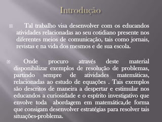 O documento aborda a utilização de atividades matemáticas relacionadas ao cotidiano dos educandos para resolver problemas e desenvolver habilidades investigativas. Ele apresenta uma série de exemplos práticos que envolvem a formulação e resolução de equações do primeiro grau, estimulando o raciocínio lógico e a aplicação de conceitos matemáticos. Além disso, enfatiza a importância de uma abordagem diferenciada para a resolução de situações-problema.