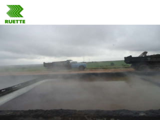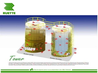 O documento descreve o tratamento de efluentes da Usina Ruette, que contratou a Mizuno para tratamento de esgoto. O processo inclui tanques anaeróbios e aeróbios, separação de ar, caixa de areia, lavagem de gases da caldeira para remoção de fuligem, decantação e moega da fuligem resultante.