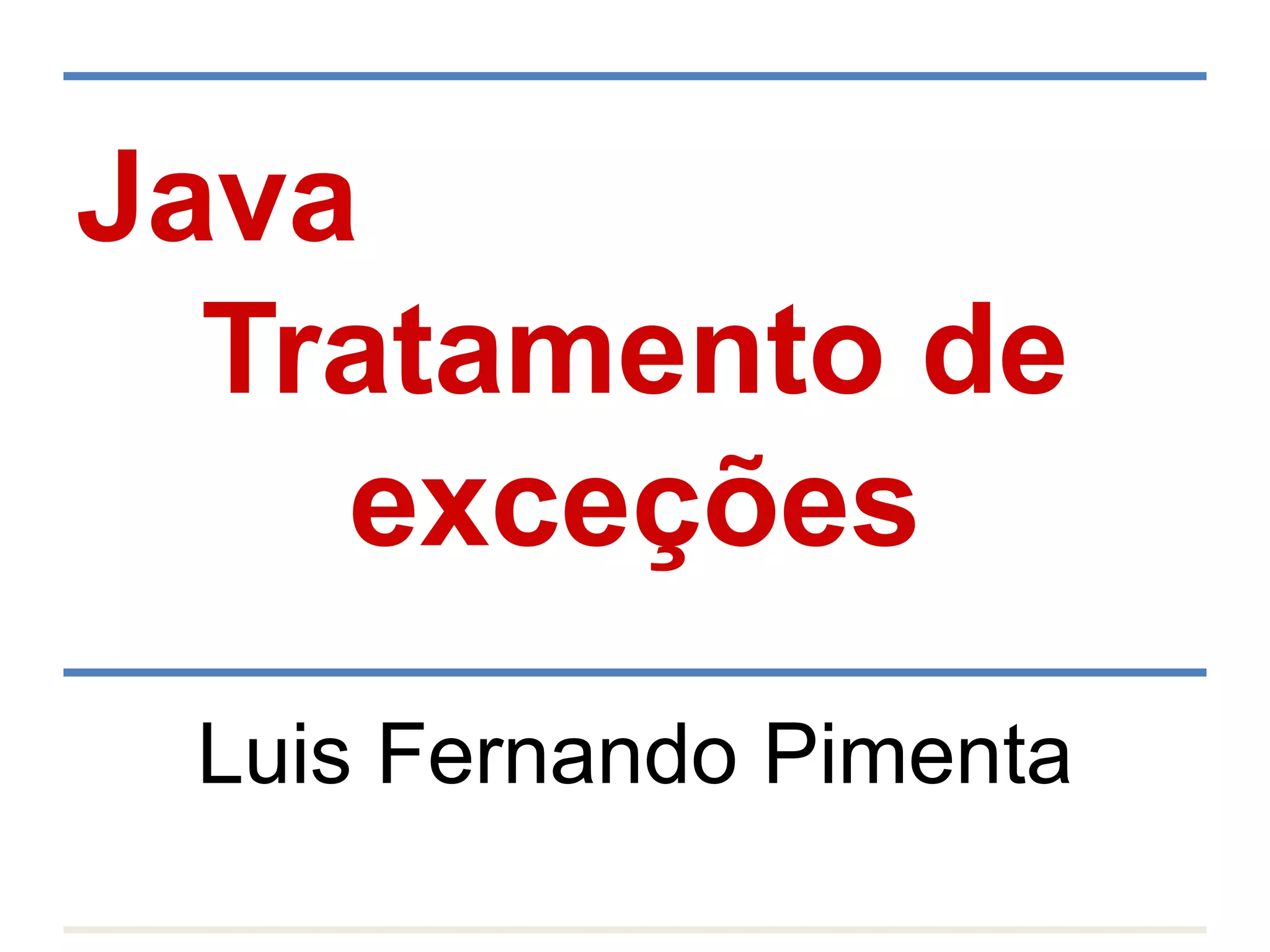 O documento discute tratamento de exceções em Java. Exceções ocorrem quando algo inesperado acontece, como tentar dividir por zero. O Java permite tratar exceções usando try-catch, onde o código de risco é no try e o catch lida com a exceção. O finally é executado independente de exceções.