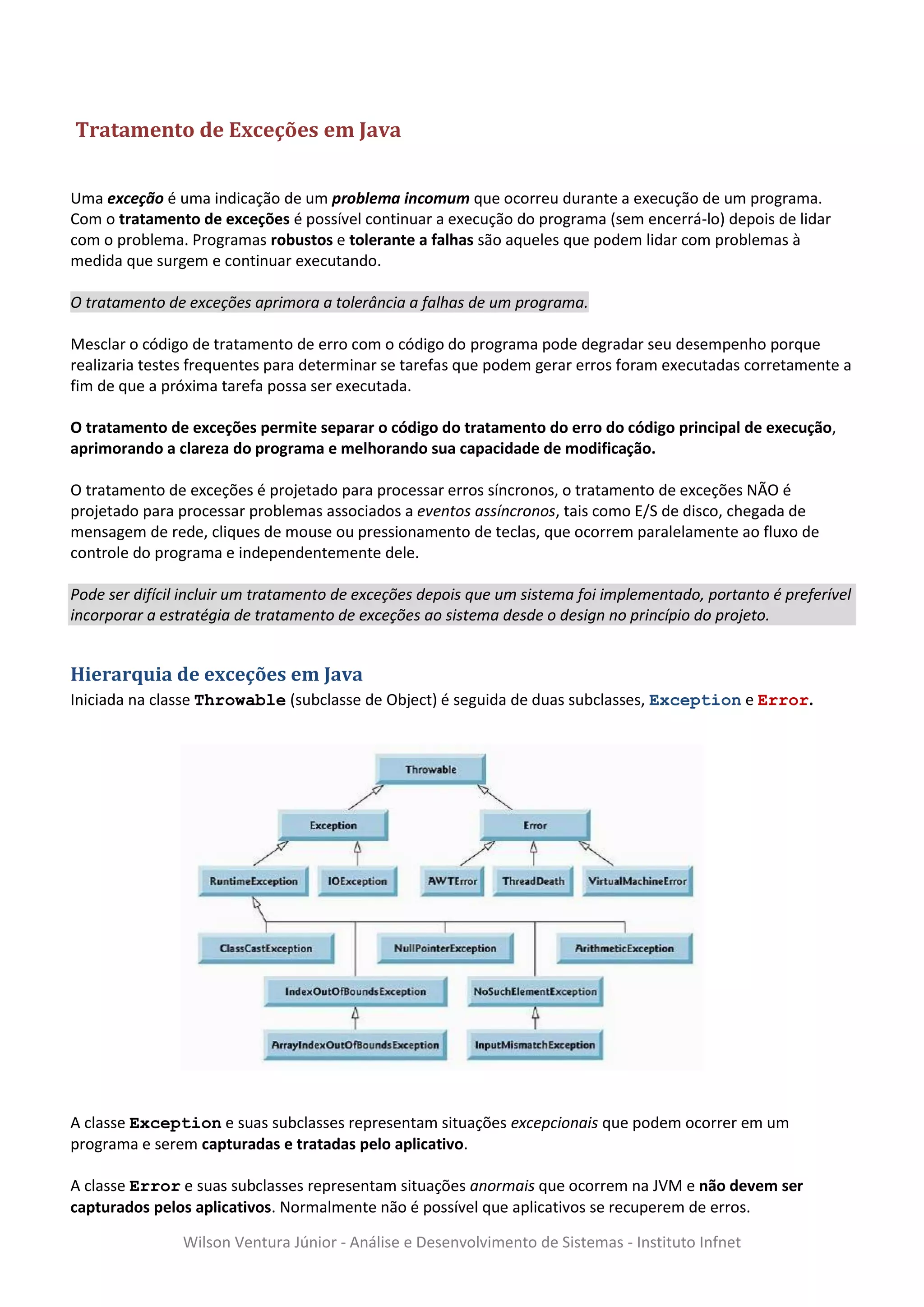 O documento aborda o tratamento de exceções em Java, explicando sua importância para a criação de programas robustos que lidam com problemas sem interromper a execução. Detalha a hierarquia de exceções, a distinção entre exceções verificadas e não verificadas, e as instruções 'try-catch' e 'throw'. Além disso, discute como criar novas exceções e a utilização de pré e pós-condições em métodos.