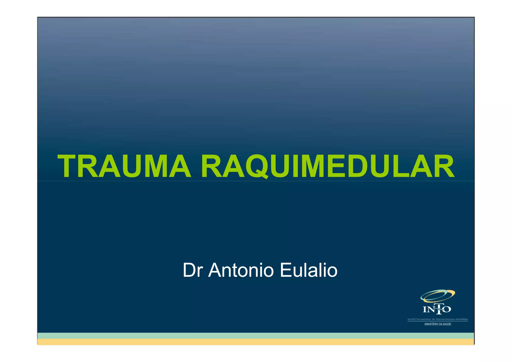 O documento discute trauma raquimedular, incluindo epidemiologia, causas, anatomia, abordagem no local do acidente, avaliação clínica, classificação da lesão, tratamento e síndromes medulares. Lesões da medula espinhal afetam principalmente homens entre 15-40 anos e custam 300 milhões de dólares por ano. Acidentes automobilísticos são a principal causa. A avaliação clínica inclui exame neurológico e classificação ASIA. O tratamento envolve estabilização, descompressão