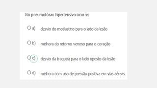 O documento discute trauma torácico, descrevendo suas causas, avaliação, anatomia envolvida e complicações possíveis, como pneumotórax, hemotórax e fraturas de costelas. Lesões torácicas podem causar danos significativos se não tratadas adequadamente, levando a hipóxia, acidose e choque. O exame físico e monitoramento do paciente são essenciais para diagnosticar e tratar lesões torácicas.