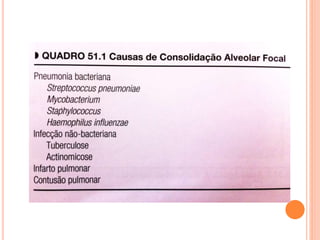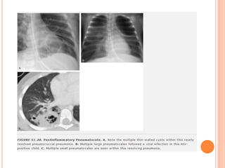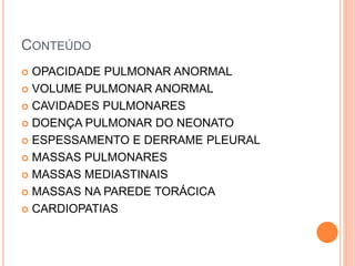 Este documento discute os principais achados de imagem no diagnóstico por raio-x do tórax da criança, incluindo opacidades pulmonares anormais, volume pulmonar anormal, cavitações pulmonares, doença pulmonar do neonato, espessamento e derrame pleural, massas pulmonares e mediastinais, e massas na parede torácica. O foco é fornecer uma visão geral dos padrões de imagem e possíveis diagnósticos diferenciais para cada achado.