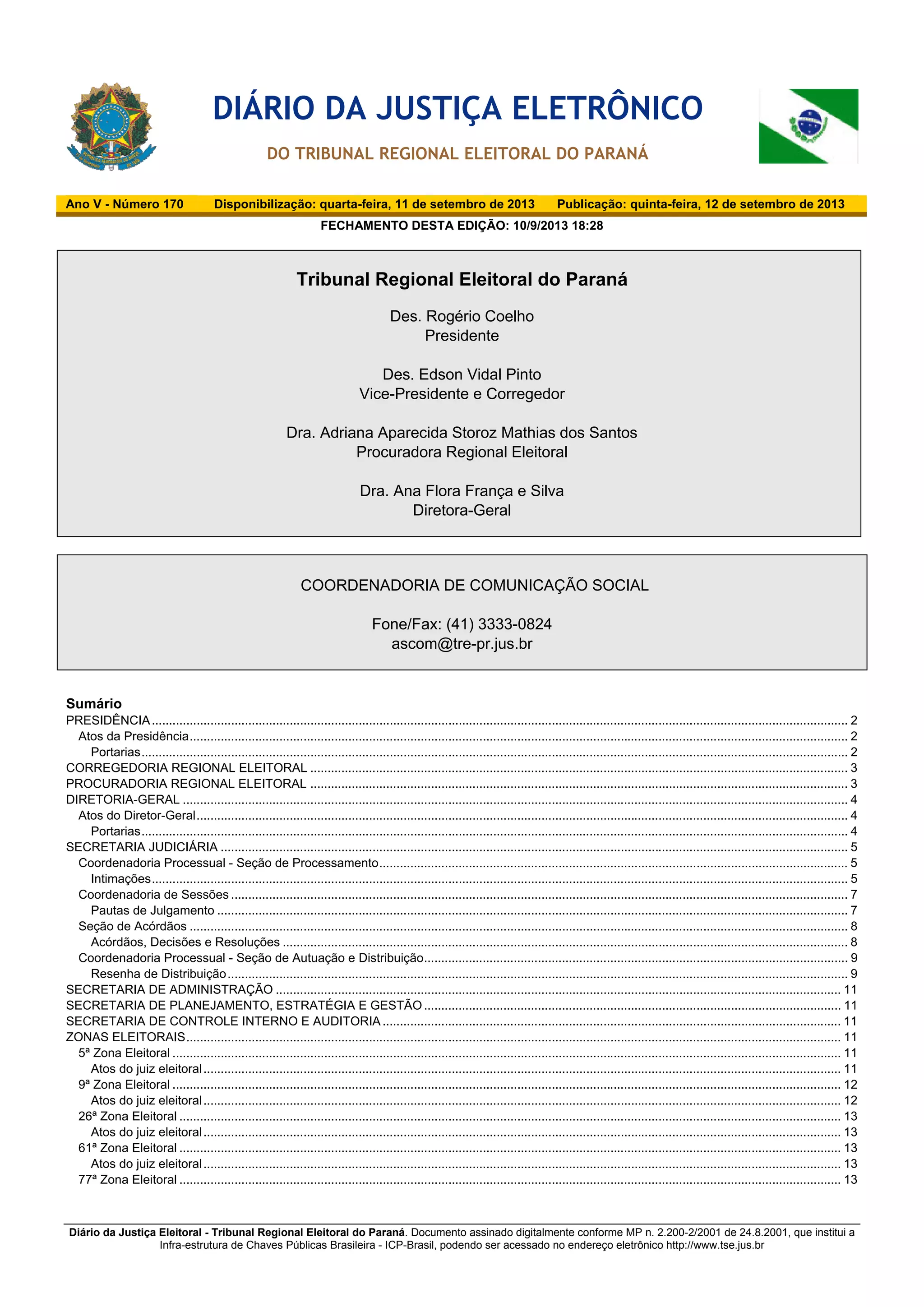 1) O documento é uma edição do Diário da Justiça Eleitoral do Tribunal Regional Eleitoral do Paraná, contendo atos da presidência, corregedoria, procuradoria e demais setores do tribunal.